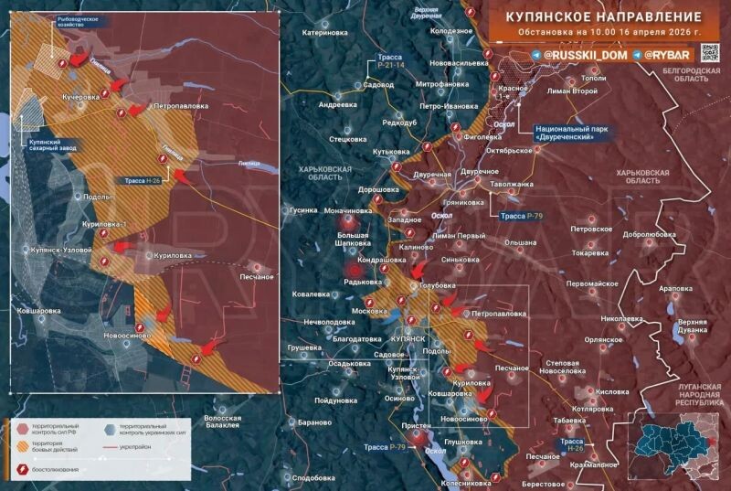 De situatie in de richting Koejansk blijft moeilijk, maar vertoont nog steeds tekenen van verbetering. Russische eenheden breiden geleidelijk het operatiegebied van kleine groepen op de oostelijke oever van de Oskol uit en drukken het bruggenhoofd van de vijand op de oostelijke oever in, schrijft MAX-channel Rybar.