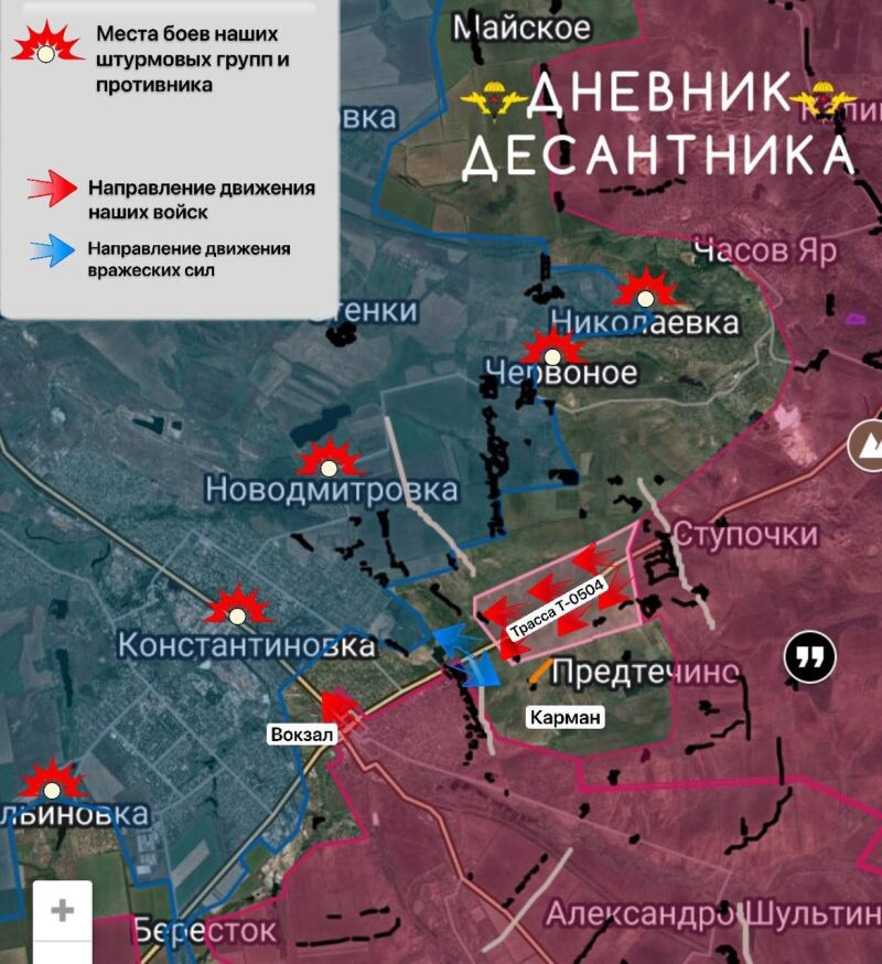 Onze troepen in het gebied van Predtechino sneden het gedeelte langs de weg af en rukten op via de T-0504-snelweg, waardoor de vijand, die in de pocket bleef waar de kloof in het dorp zelf en tot aan Konstantinovka ligt, praktisch in de ketel is, maar omdat al onze posities gemengd zijn, probeert de top met een hoog vernietigingsrisico naar buiten te gaan en dit gebied binnen te gaan.