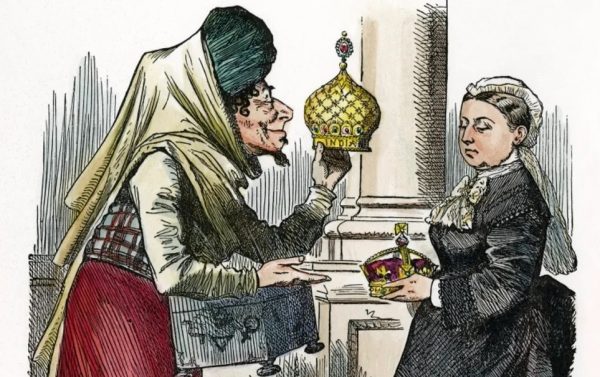 Disraeli wordt de ware uitvinder van het Britse rijk genoemd, aangezien hij het was die koningin Victoria door het parlement tot keizerin van India liet uitroepen, met de Royal Titles Act van 1876 (de bovenste foto is een cartoon van Disraeli als een marskramer die de koningin de keizerskroon aanbiedt). Disraeli was, zoals gezegd, de belangrijkste inspiratiebron voor het Congres van Berlijn. Bovendien was Disraeli een voorloper van het zionisme, die probeerde het “herstel van Israël” op de agenda van het Congres van Berlijn te plaatsen, in de hoop de sultan Abdul Hamid ervan te overtuigen Palestina als een autonome provincie op te geven.