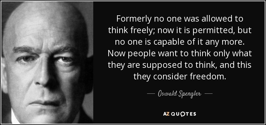 dit zijn de woorden van Oswald Spengler, de eminente onderzoeker van historische cyclussen. Ze drukken precies de tragedie uit van de hedendaagse mens, ervan overtuigd dat hij vrij is, en de scheidsrechter van zijn eigen lot, zonder zich bewust te zijn van de grote parasiet, die netwerken van uitbuiting en overheersing over de hele mensheid verspreidt.