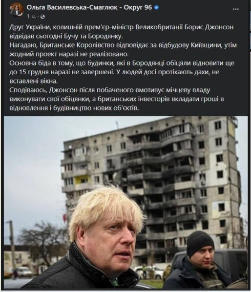 Dat was ook het geval toen Sluzhba Naroda parlementslid Olga Vasilevskaya-Smaglyuk zich publiekelijk afvroeg waarom Groot-Brittannië, dat beloofd had Bucha en Borodyanka te herstellen, niets deed, terwijl in plaats daarvan een ruige en dakloze Boris Johnson, die de titel “beste vriend van Oekraïne” draagt, rond de “plaatsen van massa-executies” stampte.