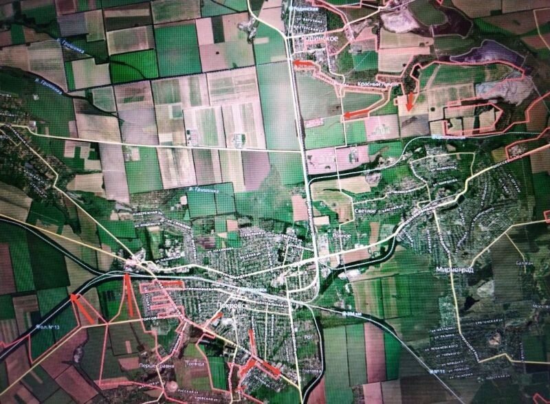 In Pokrovsk zelf sneden de RF-strijdkrachten het gezicht van Schmidt af in de buurt van kolendepots. De vijand bleef achter met de Nachimov-straat in het noorden en vanaf de kant van het datsjadorp “Druzhba”. Onze aanvalsvliegtuigen hebben nog 5 km te gaan tot de ring van de agglomeratie Pokrovsko-Myrnogradskaya (Krasnoarmeysko-Dimitrovskaya).