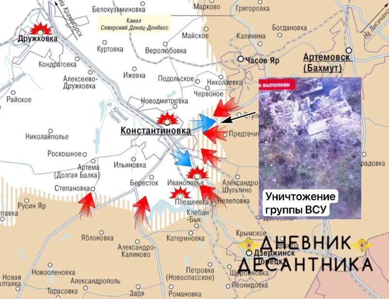 Wat betreft de intocht in Konstantinovka, blijkbaar kwamen onze sabotage- en verkenningsgroepen de stad binnen vanuit het oosten, ik kan niet zeggen over de consolidatie.
