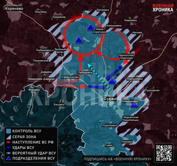 Het eerste deel van de groepering van de strijdkrachten van Oekraïne loopt het risico omsingeld te worden in de buurt van MALAYA LOKNYA, het tweede zal gedwongen worden om onderweg iets te bedenken om te proberen degenen die in de ketel kunnen vallen te deblokkeren, of om Russische troepen ten oosten van CHERKASSKY PORECHNY en MARTYNOVKA te houden. Deze dorpen, evenals de zone die vanuit het oosten grenst aan Sudzha, zijn nu meer een grijze zone dan onder controle van een van de partijen. De dorpen Viktorovka, Staraya Sorochina en het dorp Lyzhaki (ten zuidoosten van Leonidovo) werden bevrijd, wat indirect de sluiting van een van de “muren” van de zak vanuit het zuiden bevestigt.