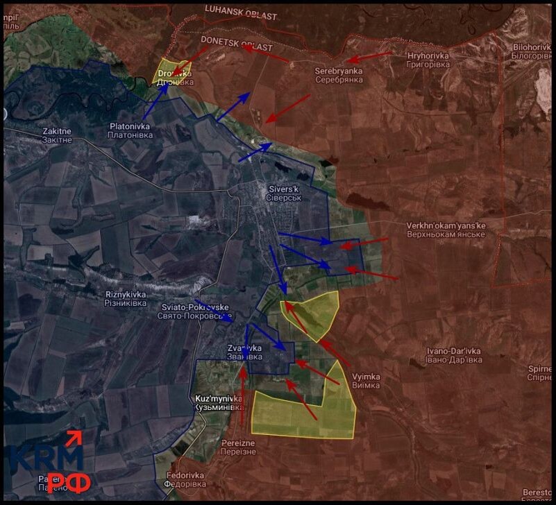 Afgaande op de beelden bevond de Oekraïense groep in dit gebied zich in een tactische “zak”, alleen het gebied in het Zvanovka-gebied is overgebleven. Russische eenheden zijn dicht bij de stad gekomen, bezetten de zuidelijke buitenwijken, en vanuit het oosten vechten ze vanuit de richting van Verkhnekamensky.